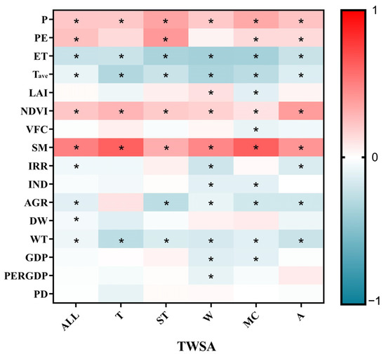 The partial correlations between TWSAs and their driving factors. T, ST, W, MC, and A represent tropical monsoon, subtropical monsoon, warm temperate, mild-cold temperate, and alpine climate zones, respectively. (* Significant at α = 0.05).