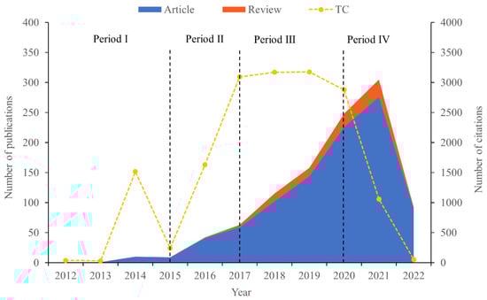 The first publication in WoSCC in the field of FBD was in 2012. Both in terms of articles and reviews, the annual publications generally show an upward trend (Figure 1). It is worth noting that there was a significant increase in 2016, 2018, and especially in 2020. We separated the whole period into four stages according to annual production and growth rates: period I (2012–2015), period II (2016–2017), period III (2018–2019), and period IV (2020–2022). In period I, there were no more than ten publications per year, but the citation rate of publications in 2014 was relatively high. In period II, both publications and citations improved, showing an overall stable trend. The citation rate had increased significantly. In period III, the number of publications was still growing and the citation rate increased slightly. During period IV, the growth in the number of publications is particularly notable, reaching a peak of publications in 2021. The citation rate started to drop in 2020, however.
