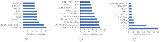 According to Figure 2a, even the most high-yield authors have published no more than ten articles. The most prolific authors are MOSAVIA A (10 publications with 206 citations), KHOSHGOFTAAR TM (9 publications with 81 citations), and LI Y (7 publications with 51 citations) (Table 1). LI Y and WANG Y published their research relatively early, publishing their first results in the FBD field in 2016. BRISCO BJ only started publishing his FBD research in 2020 but has received 276 citations. The H-index of active authors ranges from 3 to 7. MOSAVI A and KHOSHGOFTAAR TM have the highest H-index. BRISCO B also has the highest mean citations per article (5 publications with 276 citations). The top 10 institutes with the highest output in FBD research are shown in Figure 2b. Tsinghua University has published the most papers in the FBD field (n = 25), accounting for 2.31% of all publications, followed by the University of Chinese Academy of Sciences (n = 23) and the University of Florida (n = 23). From 2012 to April 2022, 91 countries published articles on FBD research. The top 10 most published countries published approximately 72.78% (n = 786) of the world’s articles (Figure 2c). China showed the highest output, with 301 FBD-related articles, followed by the US (n = 182) and India (n = 59).