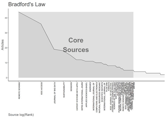 We identify the most active journals according to Bradford’s law. Our dataset had thirty-five core journals (Figure 3), and the top five were: Remote Sensing (ISSN: 2072-4292), IEEE Access (ISSN: 2169-3536), Journal of Big Data (ISSN: 2196-1115), Sustainability (ISSN: 2071-1050), and Sensors (ISSN: 1424-8220).