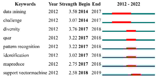 Citation burst detection reflects the dynamic changes in keywords over time in the field, which reflects an explosion of information that has attracted the researchers’ attention [44]. The number of citations for some keywords has increased sharply in a short period, allowing us to detect some exciting trends. The information for the top eight keywords with the strongest citation bursts is listed in Figure 4, and the beginning years of the bursts are in bold. We found that the citation burst for “data mining” and “challenge” were the first to appear and lasted relatively longer than the citation bursts for the other keywords. “Diversity” and “data mining” have the highest citation burst. In addition, we also discovered that the citation bursts for “diversity”, “pattern recognition”, “qsar (quantitative structure-activity relationship)”, “identification”, and “mapreduce” all occurred from 2017 to 2018. “Support vector machine” was the latest keyword to have emerged in the last five years.