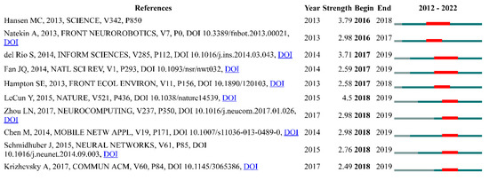 In Figure 5, the most representative references with respect to burst duration, burst strength, and burst time are illustrated based on the previous clustering result, with the beginning time of the burst marked in bold. We noticed that the article of LECUN Y et al. has the greatest burst strength. This paper suggests that deep learning could make use of the increases in the amount of available computation and data and will lead to many more successes in the future [45]. In addition, HANSEN MC’s article also has an intense citation burst. Global forest loss and gain were mapped using Earth observation satellite data from 2000 to 2012 in this paper [46]. No references with a strong citation burst have continued to maintain this level of burst.
