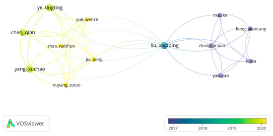 Figure 6 provides a timeline visualization of the coauthorship networks of authors. The node color indicates the mean time of author collaborations and the node size indicates the number of associations. The distance between nodes and the link thickness indicates the level of cooperation among authors. Setting a threshold of ≥2 for the number of papers published by an author in the field, a total of 266 out of 4724 authors were eligible. Most of them do not connect with each other, however: only 13 authors have collaborative relationships. The cooperation between authors is relatively scattered. The author with the most collaborative relationships is Liu Xiaoping, followed by Chen Qian, Ye Tingting, and Yang Xuchao. There has been an increase, over time, in the number of authors who had cooperative relationships. Author cooperation was mainly distributed in 2017 and 2020.