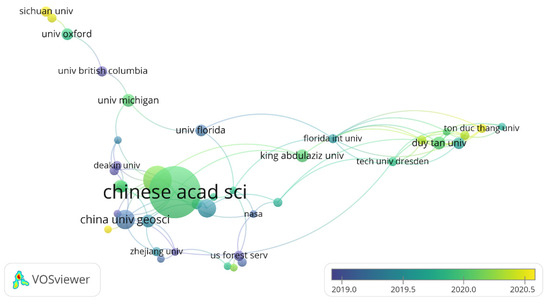 Figure 7 shows the timeline visualizations of co-authorship networks of institutes constructed in the same way as for the authors. This process showed that a number of institutes are interconnected with each other. We set the threshold for the minimum number of publications by an institute at six. As a result, 40 institutes were selected from the 1834 institutes. A quantitative disparity is evident in the collaborative network. The University of the Chinese Academy of Sciences is the leading institute with the most collaborative relationships and is at the center of the collaborations. It is worth noting, additionally, that the Chinese Academy of Sciences maintains a close cooperative relationship with most institutes. Cooperation takes place, on average, in most institutes, from 2019 to 2020.