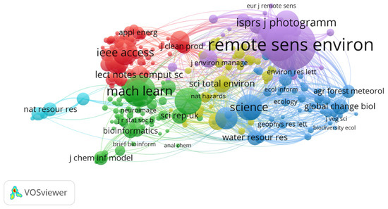 Figure 9 presents the cocitation network of journals. We set the lowest number of citations at 30, and 473 journals met this threshold from the total of 18,407 journals. Every node refers to a journal, and the node size indicates the number of citations that the journal has received. Each color represents a cluster that is formed based on cocitations. Cocitation relationships between journals are represented by links, and the thicker the link, the more citations by journals. The most frequently cited journals associated with the FBD field are found in six distinct groups (yellow, green, teal, blue, purple, and red). These are: Science of The Total Environment (ISSN: 0048-9697), Machine Learning (ISSN: 1573-0565), Science (ISSN: 0036-8075), Natural Resources Research (ISSN: 1520-7439), Remote Sensing of Environment (ISSN: 0034-4257), and IEEE Access (ISSN: 2169-3536), respectively.