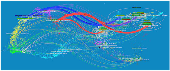 As shown by the dazzling blue and red lines in Figure 10, the dual map overlay of FBD research shows five main citation paths. The base map on the left is generated by mapping the citing journals, and the cited journals creating the base map are on the right. The different colors represent the different disciplines to which the journals belong. Research publications are therefore listed on the left and the references are listed on the right. The line path represents the citation relationship. By using citation relationships, the two maps are connected together to offer a perspective of the citation distribution of disciplines within FBD journals. The primary focus of the published articles containing FBD research was on journals in the field of “ecology, earth, marine” and “mathematics, systems, mathematical”. In contrast, most of the cited articles were published in journals in the field of “molecular, biology, genetics”, “plant, ecology, zoology”, “earth, geology, geophysics”, and “systems, computing, computer”. These publications are mainly outward-looking, absorbing knowledge from outside fields. This reflects the fact that FBD research involves interdisciplinary integration including mathematics, computational science, biology, molecular biology, ecology, and geography.