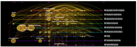 We demonstrate the current situation in FBD research with a timeline pattern of existing clusters (Figure 11). This timeline view helps to discover better the trends in the hot topics in FBD research at different periods. The modularity Q is 0.4565 and the weighted mean silhouette S is 0.7095. Nine cocitation clusters are presented with their keywords. Cluster #1 “feature selection”, #2 “gaussian process”, #3 “data science”, and #7 “remote sensing” have the longest time span, which has lasted from the emergence of the FBD research to the present day. Cluster #0 “Google Earth engine”, #1 “feature selection”, #2 “gaussian process”, #3 “data science”, #4 “machine learning”, and #5 “feature extraction” are the most critical areas of FBD research, and they continue to be active research topics. Clusters #6 “risk” and #8 “identification” were emerging hotspots in FBD research, although no new literature has yet been published in 2022 on these themes. This does not mean that these topics are no longer being researched, however, because the research period of this paper is only until April 2022, which does not fully represent the whole of 2022. Using the timeline view, in addition to the curves linking these important nodes, we can view the central knowledge structure. The location of nodes marks the first year that the keywords appeared, and the node size represents the keyword frequency. It is worth noting that the essential nodes (centrality > 0.1) are externally covered by the pink outer ring. FBD research focused mostly on the keywords “remote sensing”, “model”, “algorithm”, “forest”, “management”, “deep learning”, “artificial intelligent”, “machine learning”, “data mining”, “classification”, “prediction”, and “identification”. Over time, the keywords change and become more diverse, with researchers placing great emphasis on machine learning and data mining in FBD research.