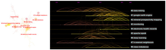 To have a better understanding of the core content of all the references, we use Citespace to describe the clustering of references, as shown in Figure 12a. All references are divided into 13 categories: the modularity Q is 0.8325 and the weighted mean silhouette S is 0.9478. The nine clusters with the highest K value are #0 “data mining”, #1 “Google Earth engine”, #2 “mineral prospectivity mapping”, #3 “monitoring”, #4 “electronic health records”, #5 “Apache Spark”, #6 “deep learning”, #7 “k-nearest neighbors”, and #9 “class imbalance”. We also performed a timeline view for clusters (Figure 12b). Each cluster was marked in a certain period, representing the time distribution and the precedence relationships between the clusters. The locations of the nodes show the first year that the references appeared. We found that “data mining” and “k-nearest neighbors” are early fields in FBD research. Of all the clusters, the start time of “electronic health records” is the latest, with the research contents continuing to expand. The current hotspots in FBD research are “Google Earth engine”, “mineral prospectivity mapping”, “monitoring”, “electronic health records”, and “class imbalance”. These research hotspots are relatively late as a whole, however, because the development of FBD started late. The rise and fall of the research topics in the above nine clusters might indicate that the research in these clusters is reaching an end, maturing, or has changed to a new research path due to breakthrough discoveries.