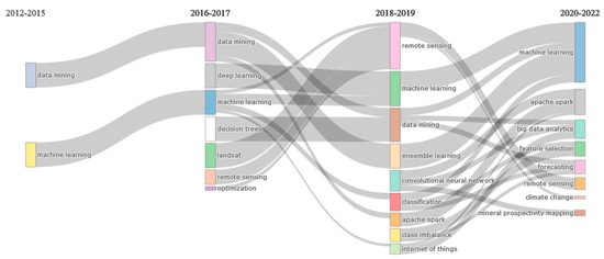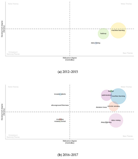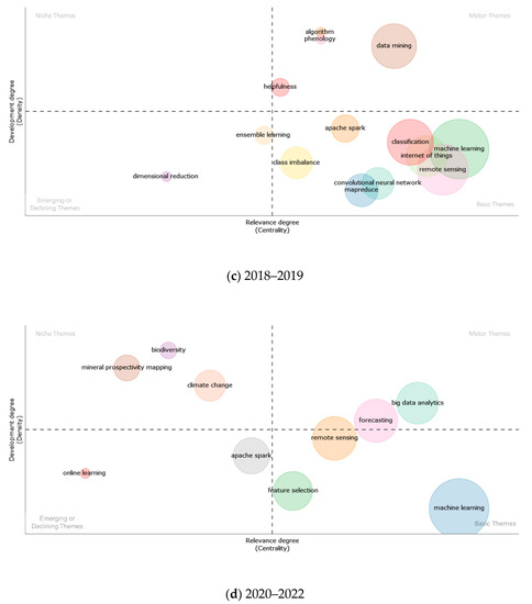 There were no isolated or emerging themes in the first subperiod (2012–2015). Research related to “Hadoop”, “machine learning”, and “data mining” were the future research trends. Among these topics, “machine learning” was partially well developed. In the second subperiod (2016–2017), the topic “remote sensing” was well developed, as were “landsat”, “optimization”, and “decision tree”, with “data mining” remaining a future research trend. Research on “invasive plants” and “aboveground biomass” appeared to be isolated, while the research on “modeling” and “rotation forest” was an emerging theme at this time. In the third subperiod (2018–2019), the topic of “internet of things” arose for the first time, as did “class imbalance”, “Apache Spark”, “mapreduce”, “convolutional neural network”, and “classification”, which were all the basic themes. In addition, “dimensional reduction” became an emerging theme. In the fourth subperiod (2020–2022), “forecasting” and “big data analytics” turned into well-developed themes. At the same time “Apache Spark” became an emerging theme, with research related to “remote sensing” and “machine learning” remaining the basic theme and critical directions for future research. The research on “biodiversity”, “mineral prospectivity mapping”, and “climate change” became highly specialized themes.