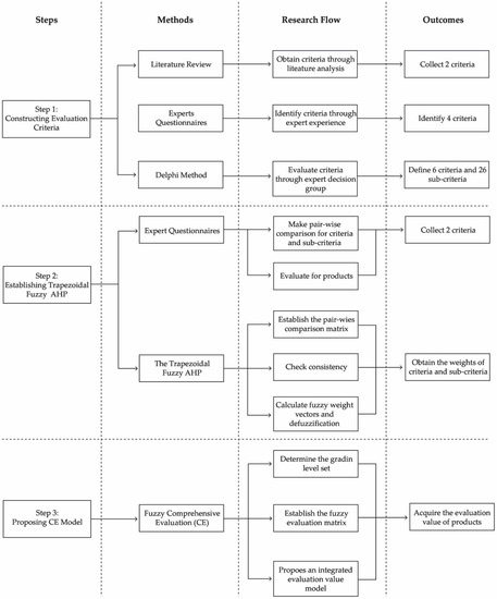 In this study, researchers propose a theoretical framework with three main steps (Figure 1). The first step is index construction, where the parameters of evaluation criteria are decided. Within this step, the research group use a literature review, expert questionnaire, and the Delphi method to identify these criteria, respectively. In the second step, the research group builds the trapezoidal AHP to obtain the weights of criteria and sub-criteria. In the third step, the CE model is based on the weights of evaluation criteria and sub-criteria, and calculates the evaluation value of the studied outdoor wooden furnishing in Harbin Pingfang Park.