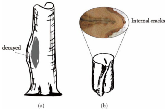 All trees have the potential to pose a certain degree of risk to nearby people, buildings, and public facilities. However, the likelihood of a safety incident tends to be minute and far less than trees’ ecological, social, and economic benefits. In the case of older trees, conditions such as aging, pests, and diseases would cause the trees themselves to weaken (such as the decay of the trunk, root damage, and trunk tilt). At that point, the tree structure is no longer reliable, and the tree can constitute a threat to people and surrounding buildings [5], which is particularly evident in old trees. Urban trees, as distinct from forest trees, are characterized by complex growth environments, greater vulnerability to damage, and wind tunnel effects caused by high-rise construction [6]. Appropriate preventive and protective measures should be taken to effectively avoid the occurrence of hazards, if tree hazards can be detected in advance.