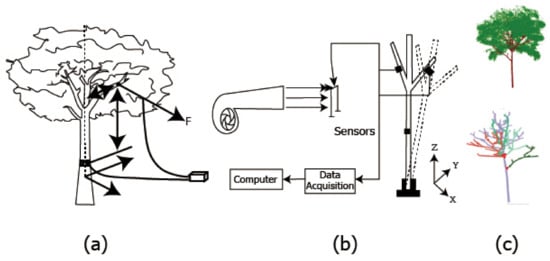 Controlled pulling tests are mainly used to study the wind-resistant deformation ability of tree crowns [94]. In order to simulate the bending and twisting deformation of a deflected canopy tree under wind load, a rope was attached to the center of the main trunk, and a horizontal tension was applied to produce a combined bending and twisting deformation of the trunk. A force transducer recorded the tensile force (Figure 2a). In contrast, the dynamic tree method, which uses barometers, tilt meters, and elastometers, provides tilt measurements under actual wind load conditions, providing realistic measurements compared to traditional controlled pulling tests and eliminating the need for human monitoring of the test process. The action of wind loads on trees is a dynamic process, so it is necessary to study the wind vibration characteristics of trees under wind loads. Kolbe (2022) [95] compared the response of trees under natural wind conditions and verified the applicability of using non-destructive pulling tests to quantify wind loads. Due to the complex structure of tree crowns and branches, researchers usually reduce tree trunks and branches to certain mechanical structures [96,97,98,99,100]. Numerical simulations are performed by building abstract mathematical models to investigate trees’ wind vibration characteristics and fall resistance under wind loads [101]. The wind vibration test chose an artificial wind source to simulate the motion characteristics of the actual wind, and acceleration sensors and data acquisition instruments collected the vibration data of the trees (Figure 2b) [88,102,103]. In order to achieve a more accurate acquisition of tree structure and physiological indicators, LiDAR technology is applied to tree information acquisition [104]. They combine computer vision and imaging algorithms, which can accurately invert tree data such as branches and trunks from scanned point cloud data, providing a basis for building three-dimensional models of trees. Jackson (2018) [105] applied dynamic modeling and analysis of complex broadleaf trees using a combination of terrestrial LiDAR and finite element analysis. Giachetti (2022) [106], in combination with finite element analysis, made it possible to identify the intrinsic frequency of trees under trees really called possible, providing a new direction for dynamic detection of trees. As shown in Figure 2b, the canopy model built by Xiao Huang et al. [107] based on the point cloud data of trees can simulate the wind resistance performance of the canopy under a wind field.