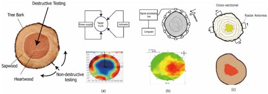 Defect detection of trunk. (a) Electrical impedance tomography (source: [118,119]); (b) stress-wave laminar imaging; (c) radar wave tomography (source: [120]).