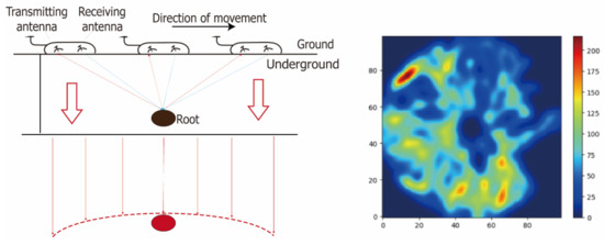 Ground-penetrating radar can detect most of the coarse roots based on the difference between the root and soil dielectric constants. [128]. Moving along a square or circular trajectory and recording the reflected signals generated by electromagnetic pulses, it generates a time-depth profile of the recorded subsurface, which is a two-dimensional representation of the subsurface (often called B-scan) [129]. The echo biplane represents the location information of the buried subsurface (as shown in Figure 4), therefore the B-scan plot can visualize the subsurface tree roots. The detection resolution of a ground-penetrating radar depends on the antenna frequency, the electromagnetic properties of the medium, and the penetration depth [130].