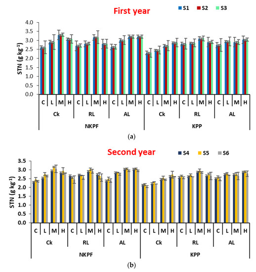 In our results, it is clear that synthetic fertilizers affected STN. Soil total nitrogen increased in M: 15 g N m−2 a−1 + 10 g P m−2 a−1, and after adding more fertilizer (i.e., H: 30 g N m−2 a−1 + 20 g P m−2 a−1) it started to reduce. In NKPF the highest value of STN was 3.30 g kg−1, 3.17 g kg−1 and 3.20 g kg−1 in M: 15 g N m−2 a−1 + 10 g P m−2 a−1 plots of CK, RL and AL, respectively, which reduced to 3.07 g kg−1, 2.80 g kg−1 and 3.20 g kg−1 in H: 30 g N m−2 a−1 + 20 g P m−2 a−1 treated plots, respectively (Figure 1a,b). A similar trend was observed in KPP; however, the values differ. As far as the soil samples are concerned, it was observed that generally the STN values during the last (i.e., sixth) sample was much less as compared to the first sample. For example in NKPF the value 3.30 g kg −1 in S1 decreased to 3.05 g kg−1 in S6 (CK- M: 15 g N m−2 a−1 + 10 g P m−2 a−1), the value 3.17 g kg−1 in the first sample decreased to 2.91 g kg −1 in S6 (RL- M: 15 g N m−2 a−1 + 10 g P m−2 a−1), while the value 3.20 g kg−1 in S1 decreased to 2.95 g kg−1 in S6 (AL- M: 15 g N m−2 a−1 + 10 g P m−2 a−1). A similar trend was observed in KPP (Figure 1a,b).