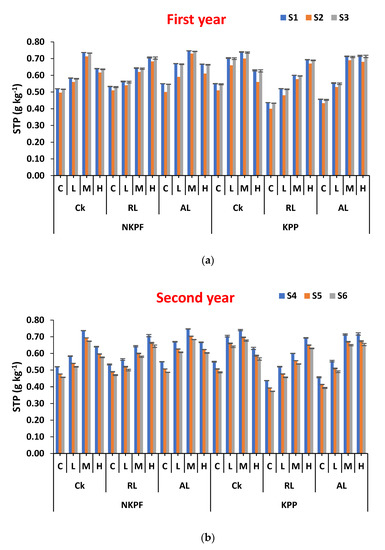 The result of our experiment showed that forest litter and NP fertilizers influenced STP in both forest types. Soil analysis in NKPF indicated that altered litter/double was most effective in enhancing the quantity of STP as the maximum value of 0.75 ± 0.04 g kg −1 was found in medium treated plots in AL. This value decreased slightly in plots where no litter alteration was performed and gave maximum value of 0.74 ± 0.01 g kg −1 in medium fertilizer application. However, in plots where litter was removed, the maximum values were observed in high fertilizer applied plots (0.71 ± 0.04 g kg −1) but the quantity was less as compared to CK and AL (Figure 2a,b). The minimum value of STP was observed in sub plots in which no NP was added. As far as KPP is concerned, the lowest quantities were detected in control plots (with no N and P application) as 0.55 ± 0.03 g kg −1, 0.44 ± 0.10 g kg −1 and 0.46 ± 0.05 g kg −1 in CK, RL and AL respectively during the S1. A maximum value of 0.74 ± 0.02 g kg −1 was estimated in CK where M: 15 g N m−2 a−1 + 10 g P m−2 a−1 was applied, whereas in RL and AL both showed highest values as 0.69 ± 0.02 g kg −1 and 0.72 ± 0.04 g kg −1 in high fertilizer treatment (H: 30 g N m−2 a−1 + 20 g P m−2 a−1) respectively (Figure 2a,b). The increase or decrease in STP was also observed during each sampling and the results revealed that at the end of experiment the STP content was reduced in comparison to sample 1. For example, in NKPF value of 0.74 S1 was reduced 0.67 in S6 (CK-M), the value of 0.71 in S1 was reduced to 0.64 in S6 (RL-H) whereas the value of 0.75 in S1 was reduced to 0.68 (AL-M). In KPP the trend in reduction of STP from S1 to S6 was similar as depicted in Figure 2a,b). The percent increase/decrease in the variables is depicted in Table 4.