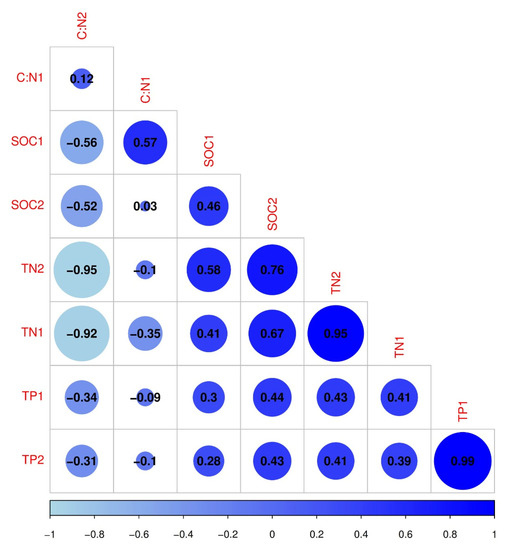 The results from our study reveal some interesting aspects regarding correlation among the observed variables. The highest R value, nearest to 1, revealed a highly positive correlation. In our study R = 0.99 was highest for TP1 and TP2 revealing that Total P in the first year is associated with increased amount during the second year of experiment revealing a buildup of TP in the soil. Nitrogen for years one and two show a positive correlation (r = 0.95), SOC2 and TN2 showed a positive correlation as well (R = 0.76), thus showing that if total N increase in soil, it positively impacts SOC and escalates its quantity. SOC also showed a positive correlation with C:N (R = 0.57) during the first year indicating that as SOC increased, C:N ratio also increased. There are also variables which showed a negative correlation with each other. For instance, TN and C:N were highly negatively correlated with one another during the second year (R = −0.95), thus showing that with increase in total nitrogen, the C:N ratio of soil decreased. R values of studied variables for both years are depicted in Figure 3.