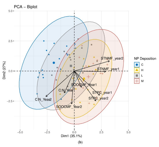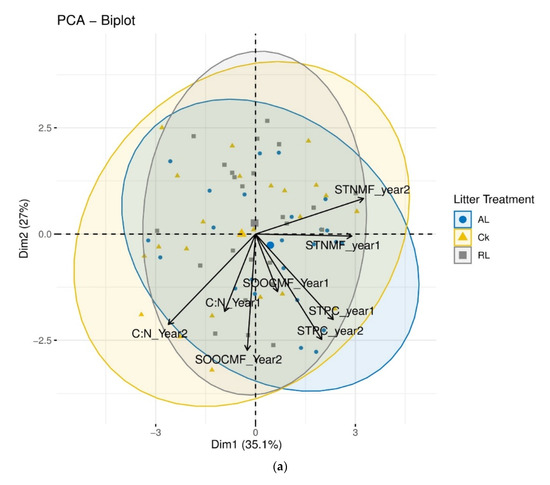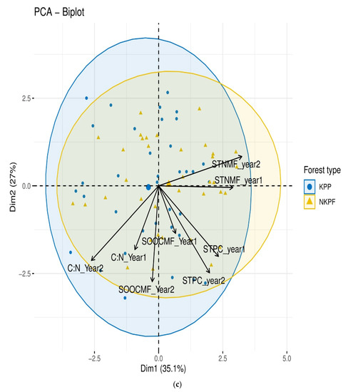 Biplots showing principal component analysis. (a) Biplot showing the two principal components and the loading vectors in a single display between litter treatments during the two years of the experiment. The principal component analysis (PCA) for measured parameters shows portioning and grouping of correlated variables. (b) Biplot showing the two principal components and the loading vectors between applied treatments (N & P). (c) Biplot showing the two principal components and the loading vectors in a single display between two forests.