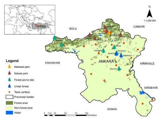 The research area in this study was actively used forest recreation sites in Ankara, the capital city of Turkey. Ankara province, located in a region of the country that suffers from a lack of forest and green spaces, is the second most populous province in Turkey, with a population of 5.75 million [50]. The forest area is 441,000 ha and the primary tree species are Austrian pine, Scotch pine, and fir; they constitute 17% of the surface area of the province [51]. In 2015, when the research data were collected in the province, there were 14 actively used forest recreation sites (Figure 1), including one national park, five nature parks, two urban forests, and six forest picnic sites, with a total area of 1794 hectares, and 301,000 people visited the sites [52,53]. The forest recreation sites provide visitors with the opportunity to participate in many activities, such as picnicking, landscape viewing, hiking, nature observation, and nature photography.