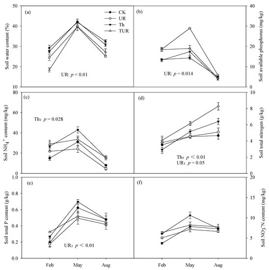 Soil characters at 0–5 cm depth as affected by thinning, understory clearance, and their combination. (a) Soil water; (b) soil available phosphorus; (c) soil NH4+-N; (d) soil total nitrogen; (e) soil total phosphorus; (f) soil NO3−-N. Values are means ± SE, n = 4. Statistical results are from a two-way repeated measurement of variance.