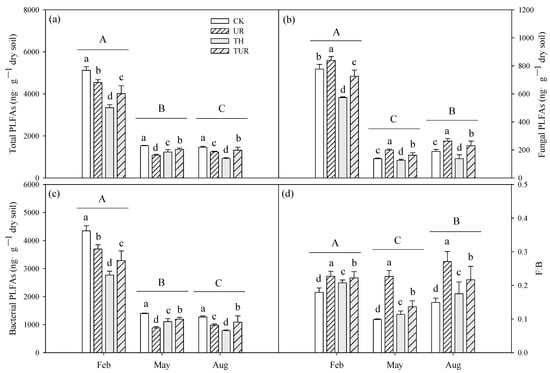 Soil total microbial biomass, fungal biomass, and bacterial biomass as indicated by total PLFAs, fungal PLFAs, and bacterial PLFAs were ranged from 923 to 5123 ng g−1, from 125 to 838 ng g−1, and from 786 to 4346 ng g−1, respectively (Figure 3). Soil sampling time caused significantly affects soil total microbial, soil fungal, and soil bacterial PLFAs, as well as the F:B ratio (Figure 3, Table 2). During the experimental period, thinning significantly decreased soil fungal and bacterial PLFAs, consequently the total PLFAs, although the F:B ratio remain unchanged (Figure 3, Table 2). In contrast, understory clearance significantly enhanced fungal PLFAs and the F:B ratio (Figure 3, Table 2). In addition, thinning and understory clearance produced significantly combination effects on total and bacterial PLFAs (Figure 3, Table 2). Specifically, both total (Figure 3a) and bacterial PLFAs (Figure 3c) were significantly lower in the UR treatment comparing to the CK treatment, while they were higher in the TUR treatment comparing to the Th treatment.