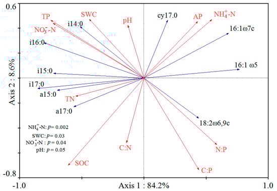 Results from redundancy analysis indicated that soil NH4+-N (p < 0.01), SWC (p < 0.05), soil NO3−-N (p = 0.04), and soil pH (p = 0.05) were apparently correlated with soil PLFA profiles (Figure 4, Table S2). In specific, soil pH, SWC, and soil NO3−-N were correlated negatively with biomarker 18:2ω6,9c, while correlated positively with biomarker i14:0, i15:0,i16:0, and cy17:0 (Figure 4). Soil NH4+-N was correlated positively with biomarker cy17:0, 16:1ω7c, and 16:1ω5, while correlated negatively with biomarker i15:0, i17:0, a15:0, and a17:0 (Figure 4). The variance of soil microbial community was totally explained 92.8% by the environmental data, and the first axis contributed 84.2% and the other 8.6% variance (Figure 4).