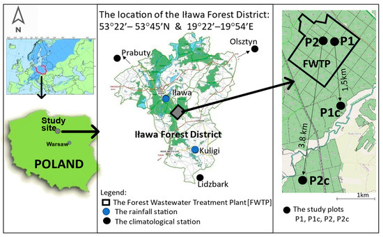 In Poland, land application of wastewater sludge has mainly been associated with agriculture [15,16]. In fact, it was in farming that wastewater generated by the potato starch industry found widespread use. In the 1970s and 1980s, attempts were also made to adapt the concepts of agricultural use of organic wastewater to the needs of forestry [17]. The positive preliminary results of both domestic and foreign studies provided a basis for the establishment of the experimental facility referred to as the Forest Wastewater Treatment Plant (abbreviation FWTP) in the Iława Forest District. The purpose of the experiment was to evaluate the possibilities for productive utilisation of organic wastewater in tree plantations. In this case, the waste to be treated in the forest environment was potato starch wastewater from the nearby starch factory (Zakłady Przemysłu Ziemniaczanego) in Iława. According to initial assumptions, the disposal of this type of wastewater in a forest ecosystem growing on relatively nutrient-poor sandy soils was expected to contribute to an increase in tree biomass and improvement in the productivity of forest stands. Potato starch wastewater is rich in such elements as nitrogen, potassium, and phosphorus; hence the expectation that it might also be used to enhance the nutrient status of forest stands. The research report from Peters [18] concerning the possible adverse effect of potato starch wastewater on the health of pine forests was not taken into account.