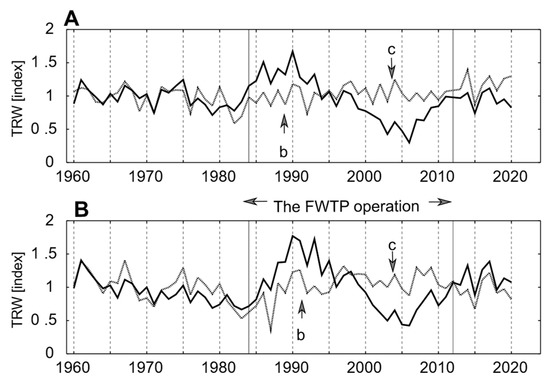 Comparison of standard chronologies of Scots pine from study plots. (A)—plots with younger trees (P1, P1 control); (B)—plots with older trees (P2, P2 control). Black lines—chronology for P1 and P2, respectively, dashed grey lines—chronology for control plots, P1 control and P2 control, respectively. The vertical lines indicate the period of operation of the Forest Wastewater Treatment Plant [FWTP]; the letters marked: b—the first decade of sprinkling with sewage of stands; c— subsequent years of the fertilization with sewage.