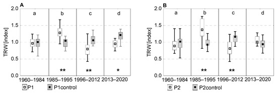 Box plots showing differences in means TRW (median) between the study stands in the different tree growth periods: a—25 years before the start of FWTP activity; b—the first 11 years of the FWTP operation; c—next years of the FWTP operation; d—years after the FWTP was closed. (A)—plots with younger trees; (B)—plots with older trees. Asterisks indicate a significant difference amongst mean tree-rings widths of Scots pine on study plots; * represents that 0.01 < p-value < 0.05; ** represents that 0 < p-value < 0.01.