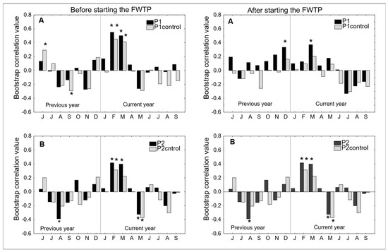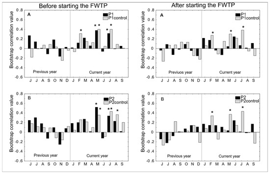 Relationships between air temperature and radial growth of Scots pine growing on the study plots (residual chronologies) for the period before fertiliser application and the period after the starting operation of the Forest Wastewater Treatment Plant. (A)—plots with younger trees; (B)—plots with older trees. Asterisks (*) indicate significance at p < 0.05.