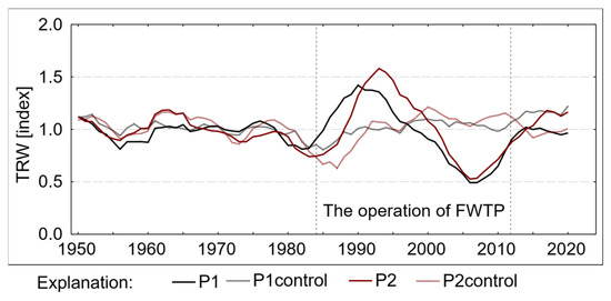 Sequences of tree-ring width (TRW) Scots pine growing on the study plots (thin grey lines—individual series, thick red line—raw chronology); (A)—for younger trees (P1 and P1 control plots); (B)—for older trees (P2 and P2 control plots). The vertical lines indicate the period of operation of the Forest Wastewater Treatment Plant [FWTP].