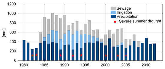 The amounts of water supplied to the stands at the Forest Wastewater Treatment Plant during the growing season in the period 1984–2010. Data on sewage and irrigation were obtained from the Iława Forest District. The years in which droughts occurred in the Iława Forest District are marked.