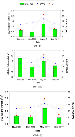 Moreover, under some soil conditions (M + L, NM + L, and NM + NL), an increase in the temperature in the dry season (May 2017) led to a corresponding increase in CO2 flux. However, no clear trends were detected between SWC or soil temperature in one side and the CO2 flux on the other side (r2 < 0.27).