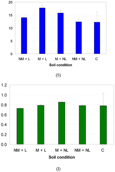 All plant diversity indexes were significantly different among the soil conditions (Table 4). In more detail, the mulched soils supported the highest species richness, especially when subjected to logging (S = 17.8 ± 1.13). The lowest S was detected in the unburned soils (12.2 ± 4.0), while intermediate values were measured in the non-mulched plots (12.3 ± 1.2, NM + NL, and 14 ± 0.7, NM + L). Similar trends were noticed for the Shannon (H) and Pielou (J) indexes, which were the highest in the mulched areas (H of 2.26 ± 0.1 and 2.33 ± 0.1, for M + L and M + NL, and J of 0.79 ± 0.02 and 0.85 ± 0.02, for M + L, respectively). In contrast, the lowest H and J values were detected in the NM + L plots (0.72 ± 0.01 and 1.90 ± 0.05, respectively), and these indexes were very close to the values that were detected in the control soils (H of 1.94 ± 0.65 and J of 0.78 ± 0.26) (Figure 3).