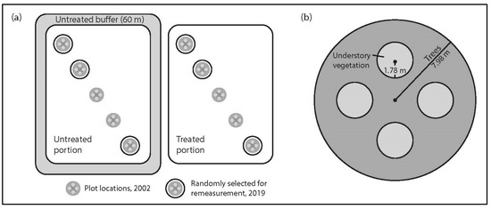 The application of glyphosate herbicide in stand tending treatments serves to shift overstory species composition and substantially increases the growth of desired tree species [1,2,3]. In 2018, glyphosate was used on 99.25% of all areas treated with herbicide for reforestation in Canada and 89.6% in Alberta [4]. The use of herbicides for reforestation is a contentious issue with plant biodiversity of particular concern [5,6,7]. There is evidence that glyphosate use affects regenerating northern forests by reducing non-conifer vegetation in the short term (two to five years), followed by longer-term changes to conifer stocking and site quality [8]. While there is an abundance of information in the literature on the short-term herbicide effects on biodiversity and wood fibre production early in the reforestation cycle [9,10,11,12], there is substantially less information on the longer-term effects.