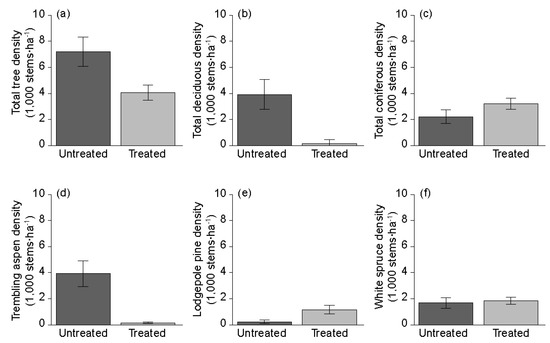 Average tree density comparisons in stems·ha−1 contrasting untreated versus treated for: (a) all tree species; (b) deciduous trees; (c) coniferous trees; (d) trembling aspen (Populus tremuloides Michx.); (e) lodgepole pine (Pinus contorta Dougl. ex Loud. var. latifolia Engelm.) and (f) white spruce (Picea glauca (Moench) Voss).