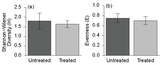 Understory plant diversity indices at the study level between untreated and treated areas: (a) Shannon-Wiener Diversity (H); (b) Evenness (E).