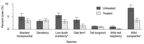 Understory plant diversity by species for untreated and treated areas. * Note: wild sarsaparilla (Aralia nudicaulis L.), low bush-cranberry (Viburnum edule (Michx.) Raf.) and oak fern (Gymnocarpium aniculate (L.) Newman) had significantly lower cover in the treated portions (p = 0.0003, 0.019 and 0.042, respectively).