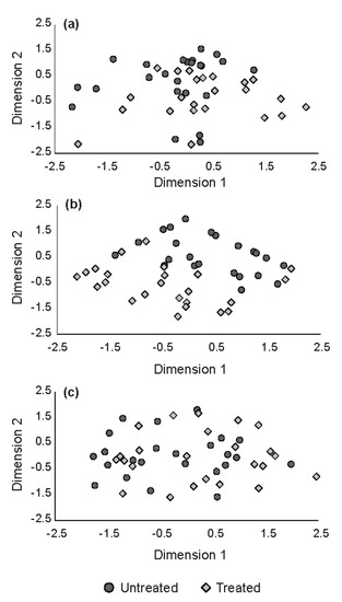 Plots from two-dimensional, non-metric multidimensional scaling (NMDS) analyses. Individual species with discriminatory power across treatments was determined using stepwise discriminant analysis (SDS). Species were considered significant based on a F test having α < 0.05: (a) all species; (b) four species identified as significant—dewberry (Rubus pubescens Raf.), blue columbine (Aquilegia brevistyla Hooker), shrubby cinquefoil (Dasiphora fruticosa (Linnaeus) Rydberg) and bryophytes; (c) all species except four identified as significant.