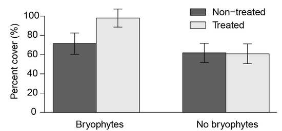Effect of bryophytes (forest floor mosses only) on total understory plant cover between untreated and treated areas.