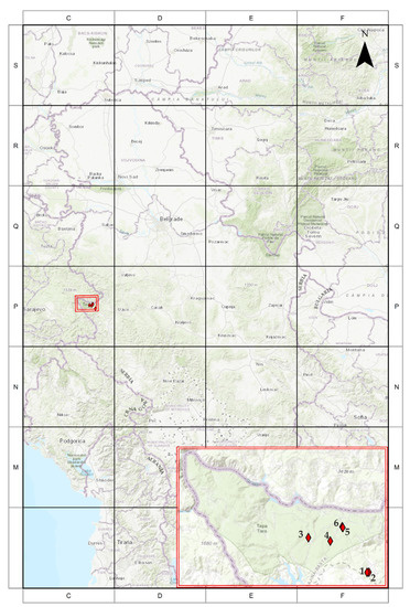 Our research was conducted at six selected sites in the Tara National Park in Serbia (Figure 1). Site No. 1 is located in the southwestern part of the National Park (43°53′25.22″ N, 19°30′43.87″ E) at an altitude of 1143 m.a.s.l. It is covered with mixed stands of spruce, fir, and beech (Piceo-Abieti-Fagetum drymetosum association). Site No. 2 was located near site No. 1 (43°53′24.63″ N 19°30′34.21″ E), at an altitude of 1155 m.a.s.l., with the same forest stands. Site No. 3 (43°53′49.49″ N 19°29′46.08″ E) was located in the western part, at an altitude of 1196 m.a.s.l. It is covered with mixed stands of spruce, fir, and beech (Piceo-Abieti-Fagetum typicum). Site No. 4 (43°55′33.85″ N 19°25′16.60″ E) is located near No. 3, with the same forest stands and at a similar altitude (1158 m.a.s.l.). Sites No. 5 (43°55′22.09″ N 19°27′13.90″ E) and No. 6 (43°56′15.19″ N 19°28′19.66″ E) are adjacent to each other and belong to the same forest stands as No. 3 and 4, with an average altitude of 1000 m.a.s.l.