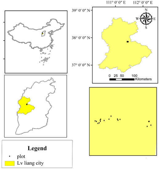 The Guandi Mountain National Forest Park is located in the middle of Shanxi Province, which spans the Jiaocheng and Fangshan counties. The geographical coordinates are 111°22′–111°33′ E, 37°45′–37°55′ N, encompassing an area of 76,135 hectares, with a forest cover rate of more than 75%. The landform is a large, undulating mountain with strong denudation. The main rock types are granite, gneiss, diabase, quartzite, and amphibolite. The study area has a temperate continental climate [27]. The annual average temperature is approximately 4.3 °C, the average temperature during the hottest month (July) is 17.5 °C, and the average temperature during the coldest month (January) is −10.2 °C. There is a frost-free period of approximately 100–125 days and the average annual precipitation is 822.6 mm.