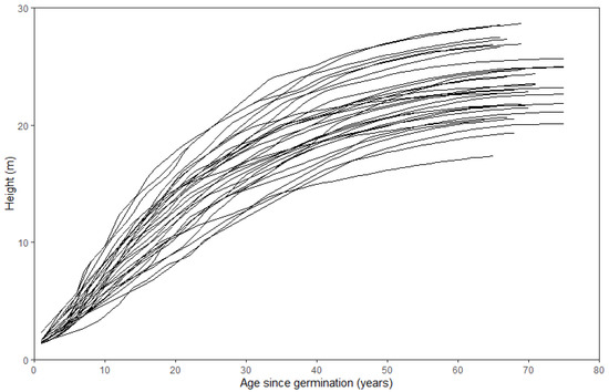 Duplat and Tran-Ha I (Model 7) provided the best fitting performance for our dataset (Table 5). This may be because this model lacks horizontal asymptotes, whereas they are present in other models [14]. For stands with an average age of more than 200 years, there is no upper limit on the growth trajectory of the tree height [19,40]. This maximum tree height was not recorded in our dataset, and the model formula characterized by inclined asymptotes seems to be more appropriate.