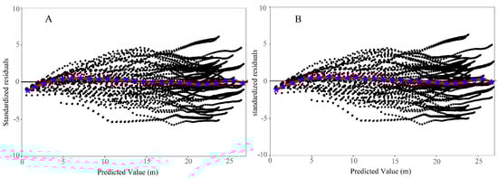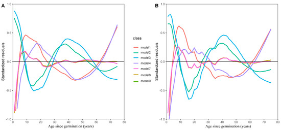 The heteroscedasticity problem in our analysis was eliminated using a variance-stabilizing function. We evaluated the three variance functions using stand age as a predictor variable in the functions (Equations (15)–(17)) and identified the one that performed the most effectively. We selected the optimal variance-stabilizing function by evaluating the AIC and −2LL values.