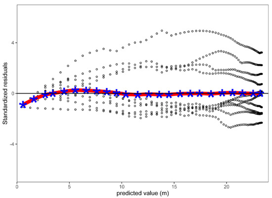 The residuals for Model 7 are shown in Figure 4 to illustrate the residual variation in the observed site indices. Analysis of residuals on the dominant height indicated that these were always equally distributed around zero, and there was no significant deviation greater than 5 m in the range of height, age, or productivity level. However, there was some deviation when the site index was less than 5 m (Figure 4).
