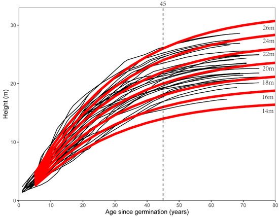 The model selected had the characteristics required for an effective site index model for use in this study. The quality of the dataset is key to the success of fitting a growth model because this should include all the possible growth conditions of the forests, such as the age group and site productivity levels. In our study, this was achieved by analyzing SA data from mature larch forests. The sampling undertaken has been shown to fully represent the site characteristics of tree species distribution in this region. This means that our dataset covers a wider range of fertility levels from 14 to 26 m in height at age 45 than that represented in the yield tables of Zhang et al. (2016) for Guandi Mountain [27].