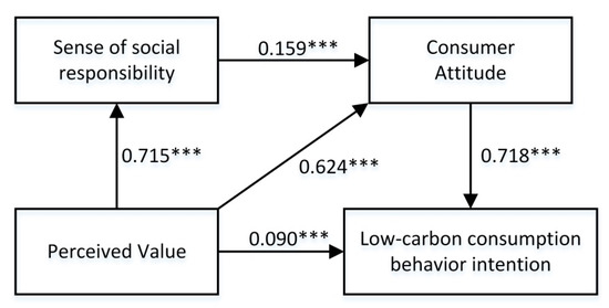 The relationship between variables can be determined by examining their path coefficients. Figure 2 presents the outcomes of the calculated SEM model. For the independent variable “perceived value”, the path coefficients determined indicate that it has significant positive effects on the sense of social responsibility, consumption attitude, and low-carbon consumption behavior intention. Therefore, H1 and H4 are supported. For the variable, sense of social responsibility, the path coefficients found indicate that it has significant positive effects on consumption attitude. Thus, H2 is supported. For the variable “consumption attitude”, the path coefficients found indicate that it has significant positive effects on low-carbon consumption behavior intention. Hence, H5 is supported.