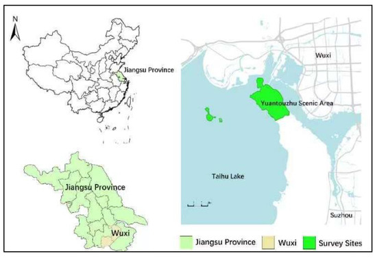 The study area of the TLICBF is located in Taihu Lake, Wuxi City, Jiangsu Province (Figure 1). The lake is the third largest freshwater lake in China, with an area of 2250 square kilometers. The lake is home to 90 islands/islets, including Yuantouzhu (also called Turtle Head Peninsula), the most popular scenic area of the lake, with over 30,000 cherry trees of different species planted. The first 1500 cherry trees were planted in the peninsula in 1988 by over 400 Japanese sponsored by the Sino-Japanese Cherry Plantation Association, whose goal was to promote cultural understanding and friendship between Japan and China through the planting of cherry trees [29]. Thus, cherry trees in the island not only symbolize the charm of nature but also the friendship between the two countries. It is said that Yuantouzhu is among the top three places in the world to view cherry blossoms (the other two are Hirosaki, Japan, which hosts the Hirosaki Cherry Blossom Festival, and the Tidal Basin in Washington, D.C., the home of the National Cherry Blossom Festival) [30].