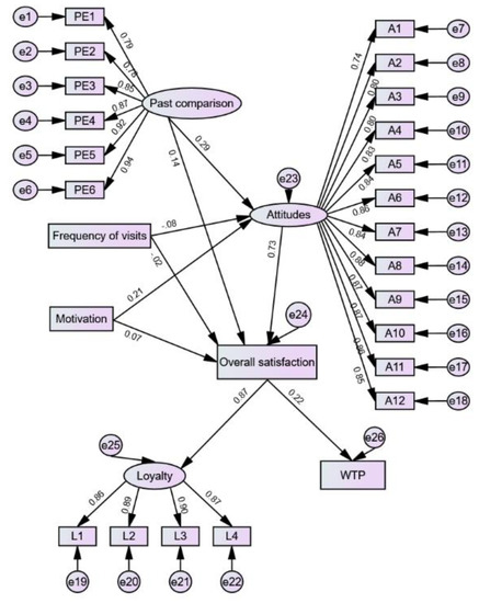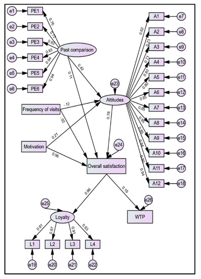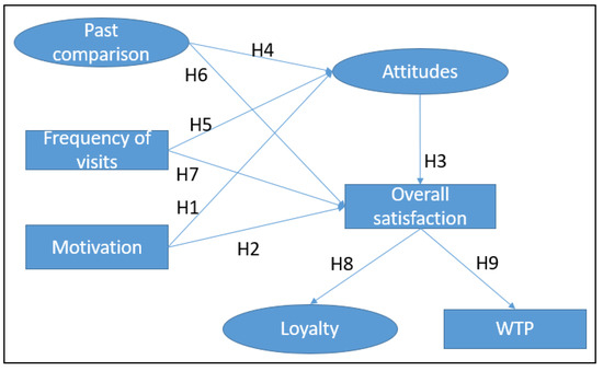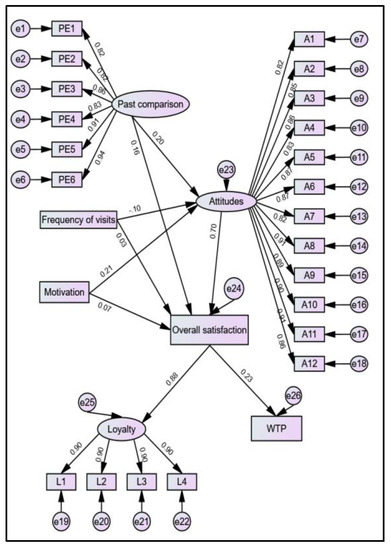 Fourth, a SEM was built to examine the relationships among past experience, motivation, attitude, OS, and loyalty (intention to revisit/word of mouth and WTP), with past experience (frequency of visits and past comparison) and motivation as antecedent variables [22]. A conceptual SEM model is presented in Figure 2.