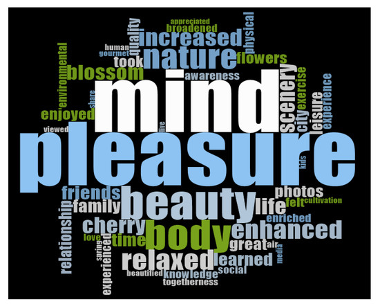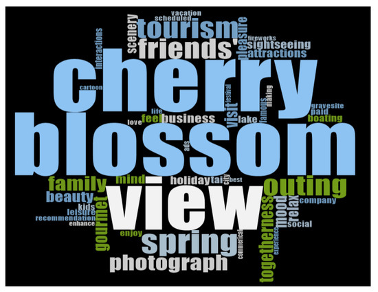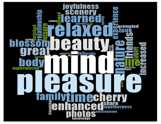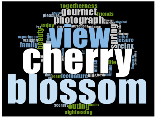 In terms of benefits, attending the festival was considered to be the source of mind pleasure, which is among the top benefits stated by both groups, with the two words “mind” and “pleasure” accounting for 18.75% and 12.46% of the total percentage, respectively. Another frequently mentioned benefit is related to beauty (4.72% for locals vs. 3.89% for tourists), which refers to the experience of natural beauty or the role of cherry blossoms in city beautification. Other common benefits for both groups include relaxation, learning knowledge about cherry blossoms, increase of environmental awareness, sharing of photos and videos via social media, family relationship enhancement, etc.